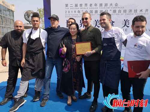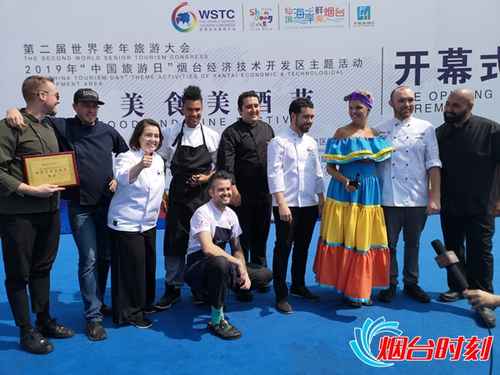 “烟台,Perfect!I love you!”15位主厨应邀上台,逐一介绍他们带来的特色美食,表达对烟台的喜爱,并领取“第二届世界老年旅游大会——世界美食美酒节纪念证书”。