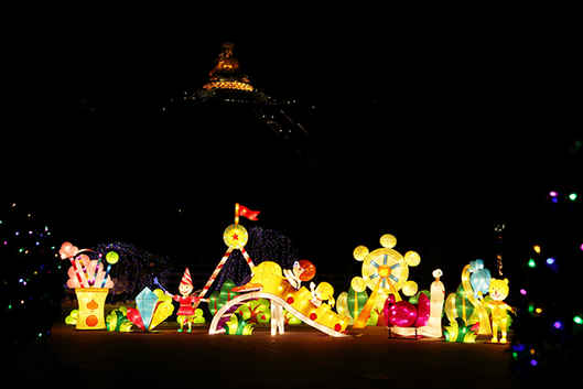 各式花灯造型多变“有灯无月不娱人,有月无灯不算春”,今年元宵节,照亮夜空的不仅是月亮和烟花,还有那一盏盏巧夺天工的花灯。由享誉“天下第一灯”美称的“南国灯城”自贡打造的上百组花灯,历时一个多月,纯手工打造,花灯造型时尚,色彩缤纷,描画出移步换景的花灯壮影。夜幕降临,整个景区流光溢彩、火树银花。各式花灯造型多变,有高人气的卡通、花卉灯组,还有的灯组将佛教文化融入其中,让人应接不暇,美不胜收。
