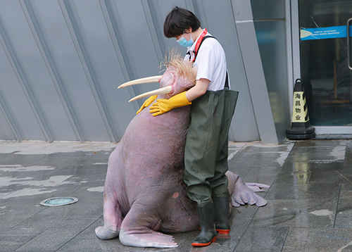 给海象刷牙除此之外,每天早上我们的驯养师也会给海狮、海象进行口腔检查,检查牙齿和口腔的健康情况。一旦发现有牙龈发炎起泡或者口腔溃疡,会用生理盐水对发病部位进行冲洗、消炎,也会带着他们出去进行日光浴。日光浴不光对牙齿、口腔发育好,也对他们毛发的生长有好处,海象奥斯卡现在正换毛准备过冬啦,他身上浅金色的毛发就是刚长出来的呢。