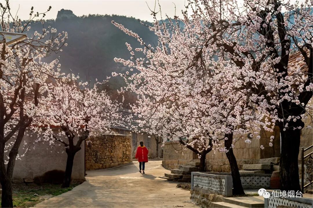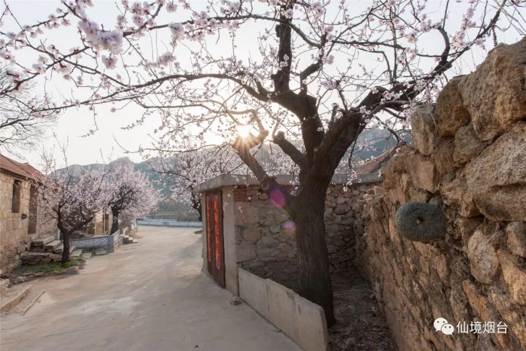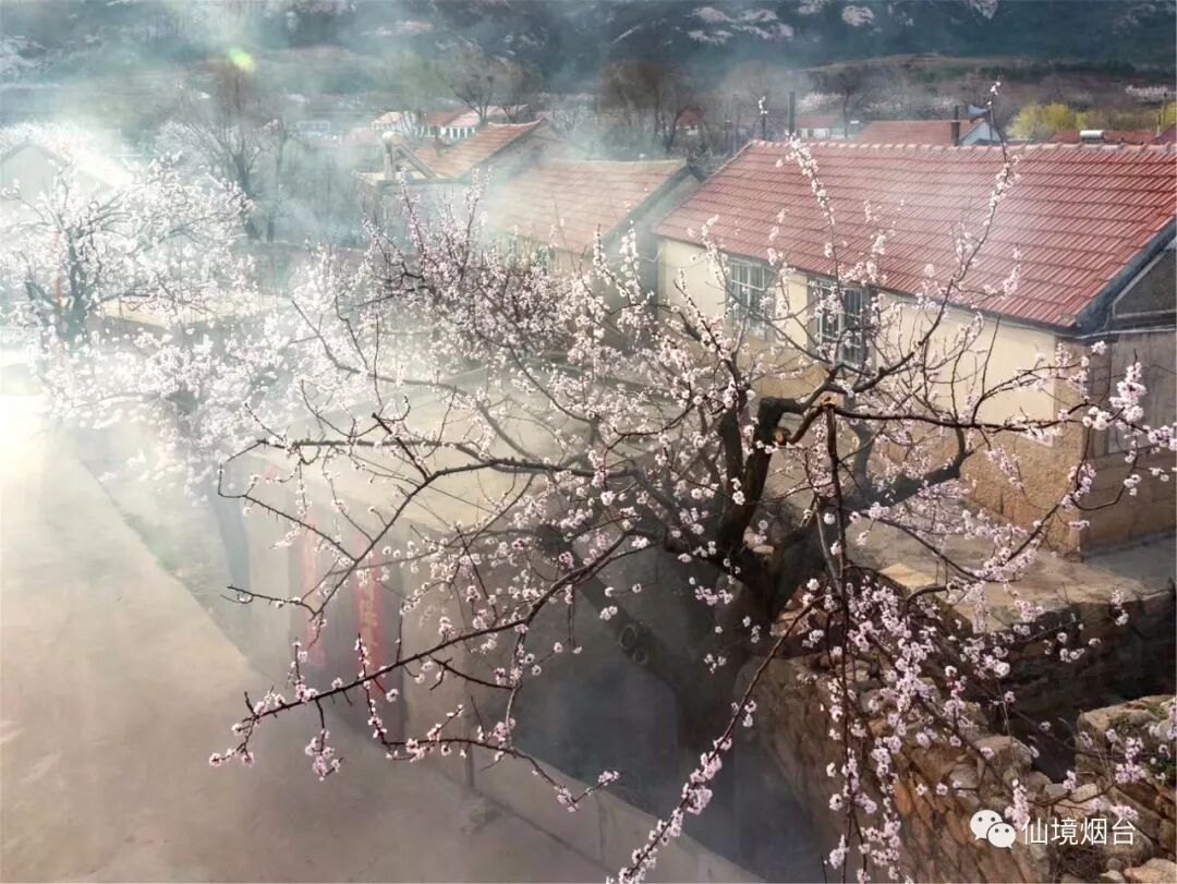 太阳的映照下,杏花树旁晨雾缭绕。 摄影:王联兴