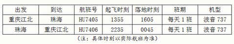 据悉,重庆-珠海航班计划由波音737客机执行,每天1班往返,具体班期如下: